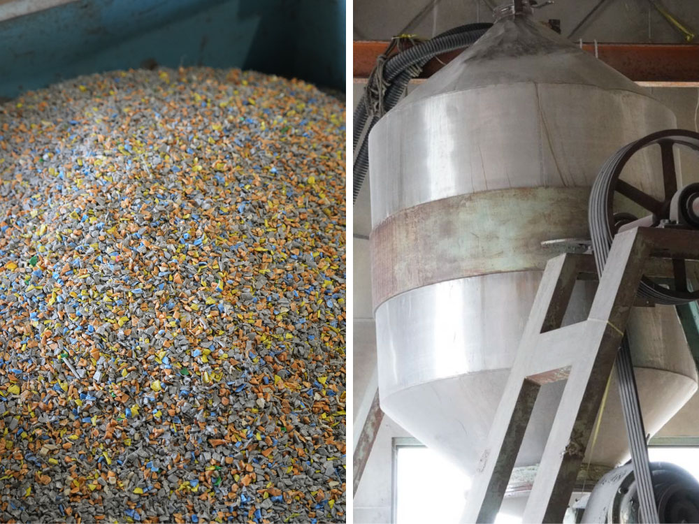 廃プラスチックを粉砕し、作成するペレットの種類別にタンブラーでブレンド撹拌します。