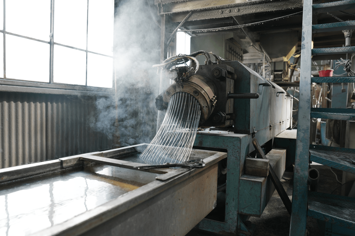 押し出された棒状の樹脂は、水槽をくぐることにより、冷却され固まります。