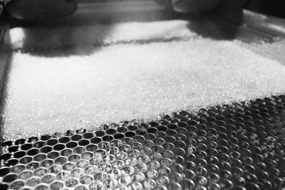 固まった樹脂を、ペレタイザーで3~5㎜程度に切断し、ペレットが完成します。